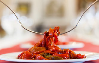 bandeja de Entrecotte de buey trinchado, acompañado de pimientos del piquillo asados y Torrija casera de pan de Laguardia sobre crema a la naranja y helado de vainilla. Un festín que tiene un precio de 45 euros más IVA.