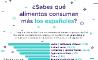 Según el último informe de consumo alimentario que publicó el Ministerio de Agricultura, Pesca y Alimentación en junio 2018, el reparto de consumo de alimentos en España es el siguiente: huevos (1.3%), vino y derivados (1.5%), aceite (1.9%), pescado (3.7%), pan (5%), bebidas refrescantes (6.4%), carne (7.3%), agua embotellada (10%), hortalizas y patatas frescas (12.3%), frutas frescas (14.4%), leche y derivados lácteos (17.4%) Cabe destacar que el resto de productos alimenticios (18.8%) también supone nuestro mayor gasto económico a la hora de hacer la compra con un 23.1% del precio total.