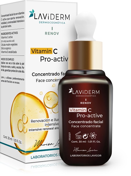 Vitamin C Pro activ, de la gama Renov de Laviderm, es un tratamiento de renovación e iluminación intensiva a base de Vitamina C activada y silicio orgánico