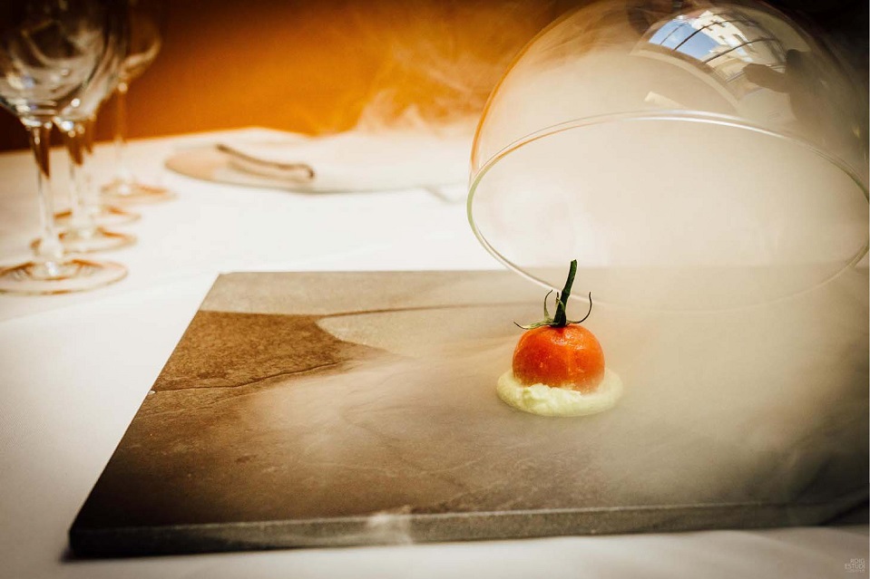 Montaje: En el fondo del plato poner una cucharada de ajoverde, el tomatito relleno encima con la ramita y tapar con la campana. Ahumar con madera de roble.