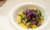 Para saciarnos de forma saludable se puede optar por un rosti de zanahoria, puerro y maní con mayonesa al curri, un risotto silvestre de espárragos, calabacín y pomada de ajo asado o una lasaña verde de espinacas, sencilla pero deliciosa. De entre los nuevos platos destaca además la nueva receta de ceviche de lubina, marinado en leche de coco sobre base de mango y lima, que propone un mix de sabores exóticos. La panacota de arándanos sobre crema de yogur y chocolate blanco hará feliz a los comensales más golosos.