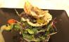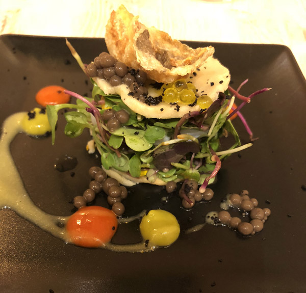 Ensalada de brandada de bacalao con chutney de pimientos, caviar de aceite y olivas negras