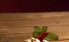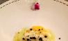Ensalada de brandada de bacalao con chutney de pimientos, caviar de aceite y olivas negras