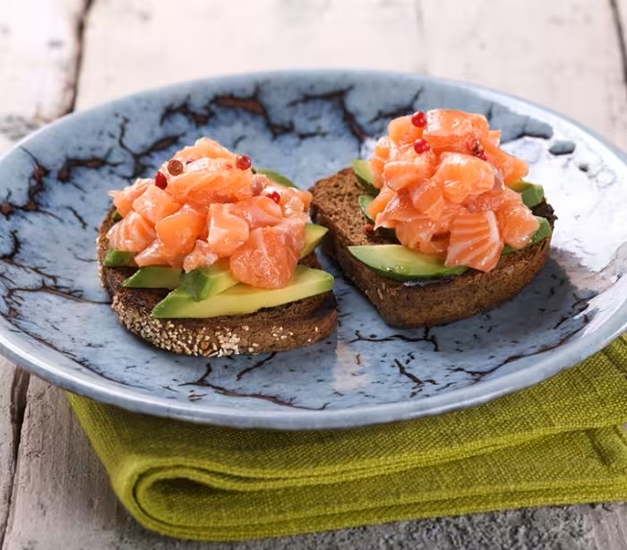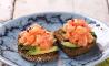 - Prepare cada tostada, colocando unas rodajas de aguacate, salmón y granos de pimienta roja como aderezo.