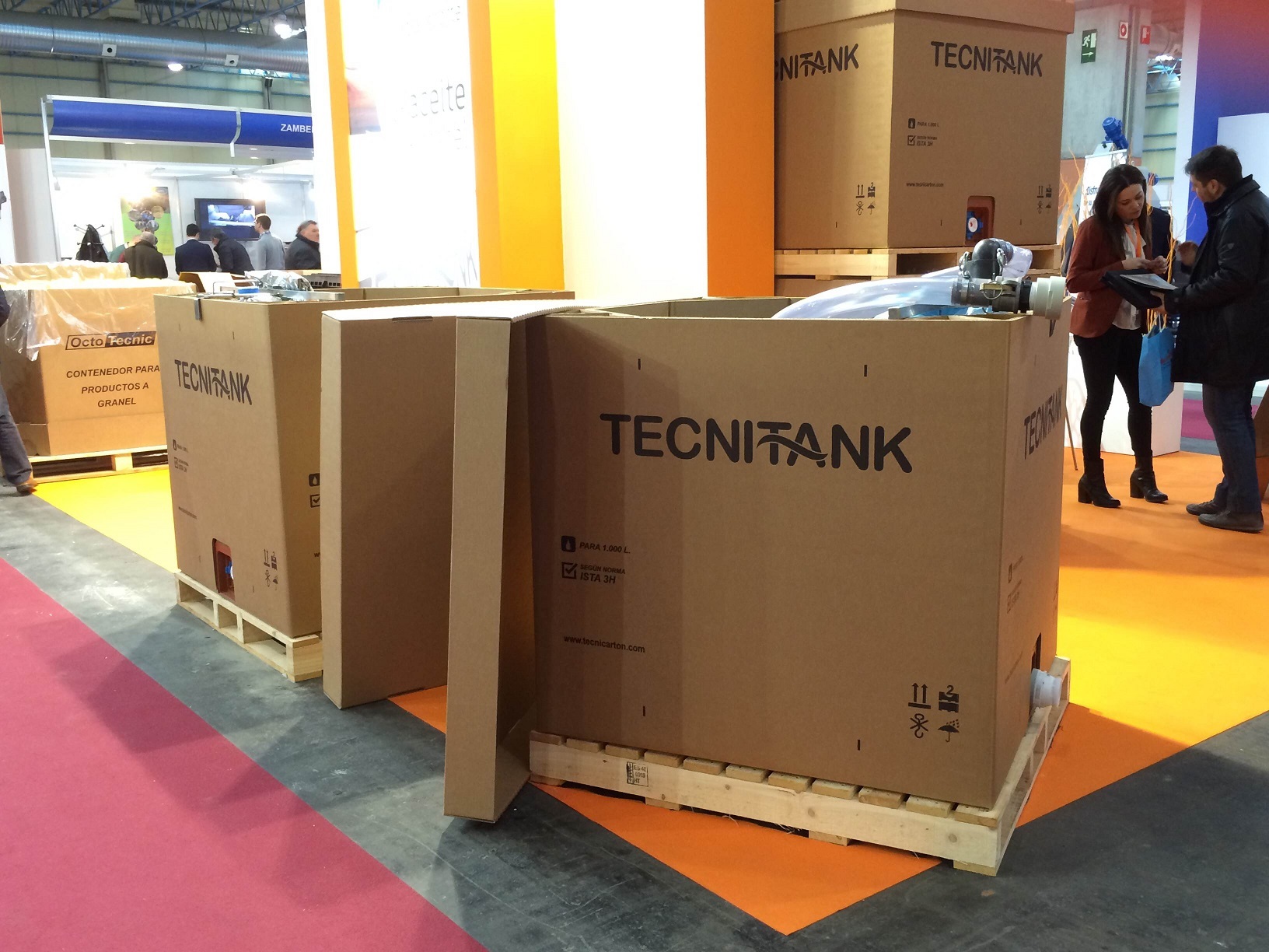 Tecnicarton, empresa especializada en embalaje industrial, ha aprovechado el escaparate de la feria para presentar este contenedor, con capacidad para 1.000 litros y apilable, que permite el transporte de vinos, aceites y otros líquidos alimentarios.