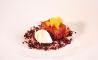 Ponemos en la base crema de café, sobre ella desmenuzamos el crumble. Colocamos a un lado la torrija y al otro un poco de helado de limón. Decoramos con naranja confitada.