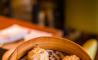 Codorniz estofada con infusión de trompeta de los muertos y champiñón