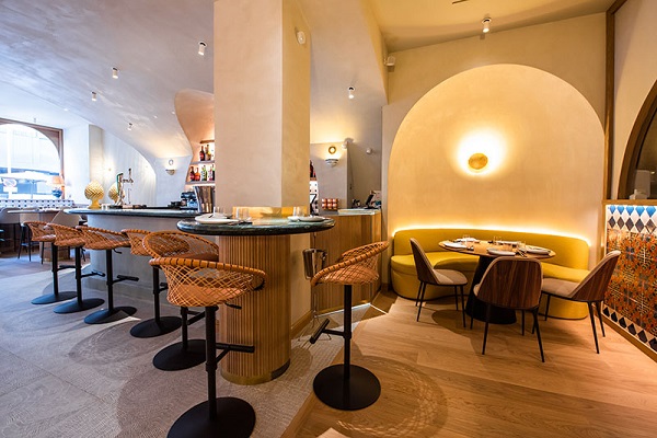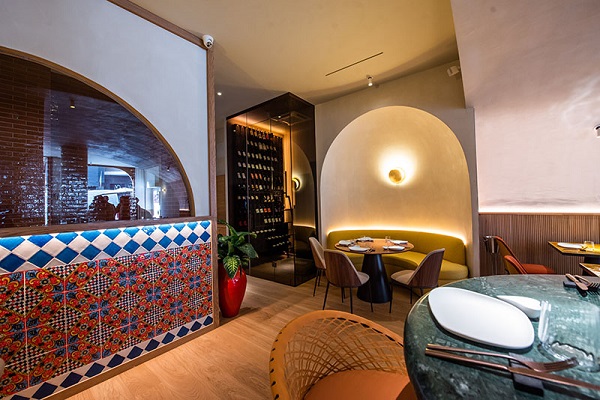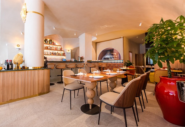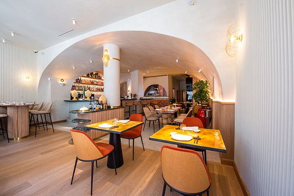 Y si no se descuida nada en lo gastronómico, tampoco se hace en el ambiente o el servicio, donde el atento personal de sala aconseja sobre cualquier plato de la carta -que a primera vista se antoja difícil con tanto ingrediente autóctono, aunque está perfectamente explicada- y su maridaje idóneo. El entorno también merece atención: elegante y con una exquisita sencillez, con la clase que ha plasmado en cada rincón el prestigioso estudio Cousi Interiorismo. Amplio, diáfano, con techos abovedados, colores cálidos y protagonismo de las líneas curvas. Tiene una gran barra sinuosa, una zona de mesas altas, varias mesas redondas y ovaladas en sala, y al fondo… el corazón de Ozio, su bonito horno, que se puede ver a través del cristal que se apoya sobre un muro de coloridos azulejos sicilianos. Y hablando de elementos tradicionales, hay que fijarse en las teste di moro, unos llamativos maceteros con forma de cabeza de hombre y mujer que emulan una leyenda italiana; las piñas, emblema de la zona y símbolo de buen augurio, fertilidad y fuerza; y los icónicos colores de las mesas esmaltadas con lava del Etna, material con el que también están hechos los posacubiertos. Para quien prefiera estar al aire libre, también cuenta con una coqueta y agradable terraza.