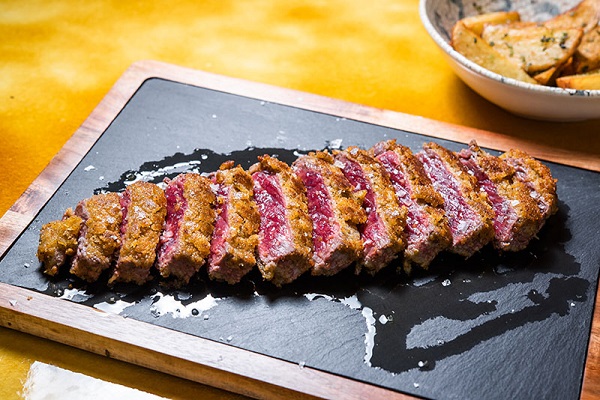 Entre las especialidades italianas que hay en Ozio, no podría faltar la pasta, donde destacan sus Busiati con pesto de Trapani, a los que añaden tartar de carabinero, o los Pici con sardinas y pan rallado tostado, una receta de influencia árabe. Pasamos por otro de los must del país de la bota, donde encontramos algunas pizzas de autor, porque Dario siempre investiga, y además de las clásicas -con la Margherita DOP como emblema, pero hecha con su queso zizzona-, elabora especiales a las que no hay que quitarles ojo, como la Covaccino Bronte, con burrata, mortadela Favola y pesto de pistacho de Bronte. Están separadas entre napolitanas y sicilianas, y entre las más típicas de su zona está la Rianata, con pesto de perejil y almendras, anchoas, tomates cherry pera de colores, quesos tuma y pecorino, aceite de ajo y orégano. En total hay 16, de gran calidad, con poca sal, fermentadas durante 72 h y muy saludables; sin duda cada visita merece probar una diferente. Entre los segundos, dos de carne y dos de pescado, donde destaca su imprescindible Tagliata de lomo bajo empanada al estilo de Palermo -con carne con D.O. española, de Castilla y la Mancha- y los Rollitos de sardinas al horno, con miga de pan perfumada a la naranja, cebolla agridulce, pasas y aceitunas taggiasca.