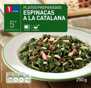 Espinacas a la catalana: Plato tradicional a base de espinacas, bacón, pasas y piñones, que está listo en tan sólo 4 minutos en el microondas. Pack 250g. PVP: 2,5€. Sólo se comercializa en Cataluña