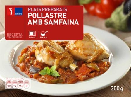 Pollastre amb samfaina: Muslo de pollo asado con pesto. Pack 300g. Sólo se comercializa en Cataluña. PVP: 3,49€