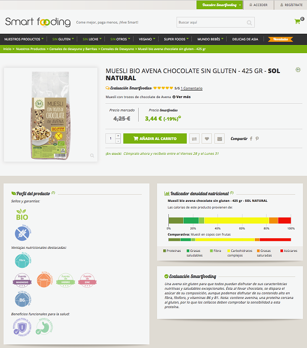 Otro punto clave de la e-shop es la información nutricional que se ofrece de cada uno de los productos. Gracias a iconos coloridos y a un gráfico didáctico de densidad nutricional, se puede evaluar a simple vista el valor nutricional de cada uno. Además, al ser una plataforma colaborativa, los usuarios pueden valorar los productos, comentar y compartir recetas o proponer nuevas incorporaciones al catálogo. Éste siempre está en continuo cambio. “Por este motivo en Smartfooding hablamos de comunidad, porque todos participan de este tipo de alimentación, tienen acceso a la información y pueden opinar sobre aquello que más les gusta y cómo lo han utilizado. Alrededor de cada producto existe una historia que entre todos hemos construido”, explica Alexandre Raksanyi.