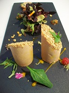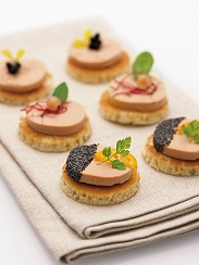 Dúo de Ficelles de Foie gras de Pato con frutos rojos, pan de pasas y puré de boniato