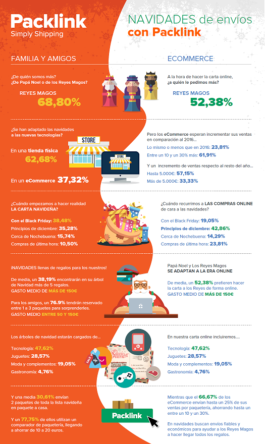 Por eso, Packlink, la plataforma española de comparación y contratación online de servicios de mensajería, ha realizado un estudio para saber más detalles sobre los gustos navideños y nos hemos encontrado con algunas particularidades que queremos compartir con vosotros con esta infografía.