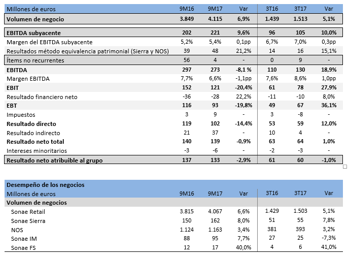 El EBITDA subyacente de Sonae alcanzó los 221 M€, es decir, 19 M€ (+9,6%) frente a los 9M16, y todo gracias al desarrollo positivo del área de comercio minorista y de los servicios financieros. El margen de EBITDA subyacente de Sonae mejoró 10 puntos base frente a los 9M16 y alcanzó el 5,4%. En el 3T17 el EBITDA subyacente fue de 105 M€, un crecimiento del 10% en términos homólogos.