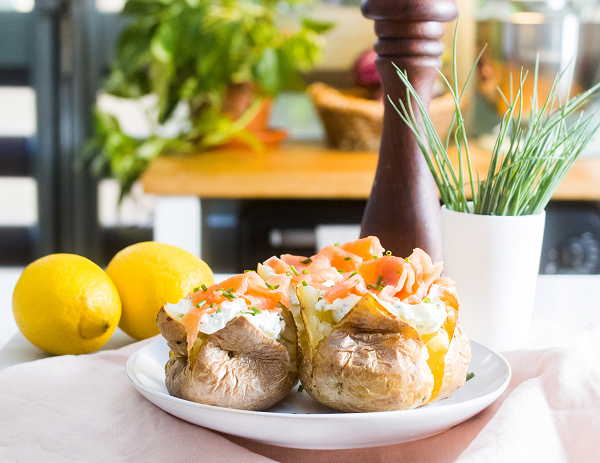 8.Colocar una cucharada de relleno sobre las patatas y terminar con unas lonchas de salmón ahumado y cebollino picado.