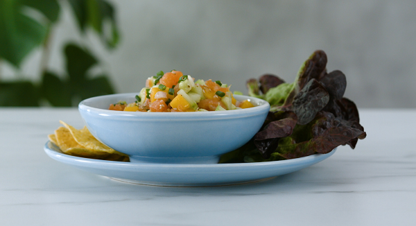 4.Mezclar en un bowl las cintas de salmón ahumado junto con el cebollino, el aguacate, el pepino y el mango.