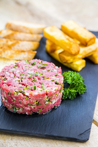 Steak tartar de solomillo, servido con patatas fritas y pan laminado crujiente