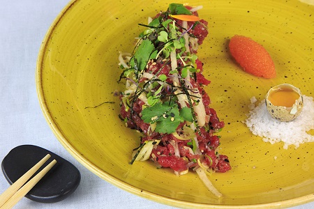 Yukke estilo sueco con pera japonesa Nashi y acompañada con caviar Kalix