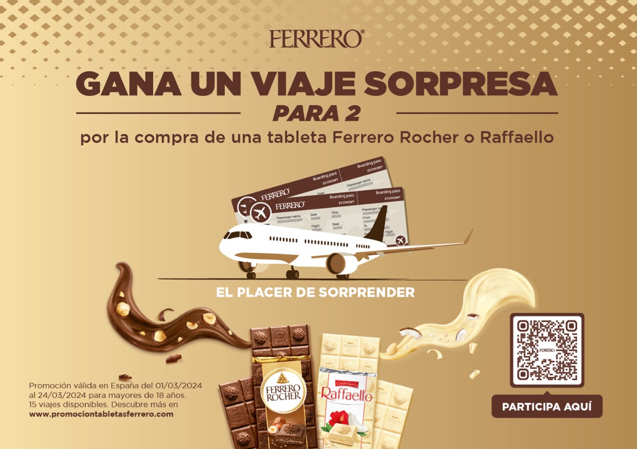 Ferrero lanza una promoción irresistible para los amantes del chocolate, con la que sortea 15 viajes sorpresa por Europa para 2 personas. Para participar en la promoción y poder ganar uno de los viajes, únicamente hay que presentar un tique de compra de cualquier variedad de las tabletas de Ferrero Rocher o Raffaello.