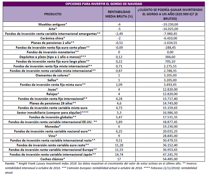 Kelisto.es ha elaborado un listado de inversiones, ordenadas en función de su rentabilidad, para responder a las necesidades de cada perfil de ganador del Gordo de Navidad.