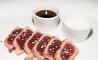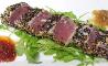 Tataki de atún con costra de sésamo negro y blanco, rúcula, cebolla caramelizada y confitura de tomate