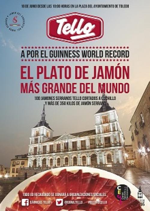 En el acto, que se celebrará dentro del entorno de Toledo - Capital Española de la Gastronomía 2016, más de 60 cortadores de jamón cortarán 100 jamones Tello con el sello del Consorcio de Jamón Serrano. En torno a las 13:00h se espera elaborar un plato compuesto por más de 350 kilogramos de lonchas de jamón serrano Tello que ocupará una superficie de más de 120 metros cuadrados, que sería el plato de jamón cortado a mano más grande del mundo.