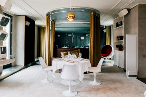 El espacio gastronómico representa la residencia del propietario del antiguo Hotel Roma, y en ella todo recuerda a los años 70. En la quinta planta se encuentran diferentes estancias, como una zona de barra para tomar un aperitivo, y una biblioteca y un antiguo estudio de grabación con todos sus elementos donde compartir un almuerzo o una cena con una ambientación que refleja la autenticidad del lugar. La sexta planta cuenta con dos amplias terrazas con fantásticas vistas a la Gran Vía madrileña y a la calle Clavel, y dos estancias, el dormitorio principal y el baño, también convertidos en zona de restauración.