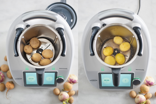 Ahora, con la última actualización del software de Thermomix®, el modo “Pelar” permitirá pelar fácilmente patatas y otras hortalizas. El funcionamiento será muy sencillo: tan solo habrá que colocar el nuevo cubrecuchillas pelador en el fondo del vaso, depositar nuestras patatas u hortalizas y añadir un jarro de agua. Por último, seleccionar el modo “Pelar”, con el tiempo adecuado y… ¡Voilà! Con la fricción entre el vaso y los alimentos, el pelador los irá pelando poco a poco.