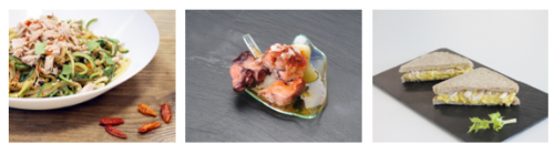 • Recetas con conservas de pescado: platos como ensalada de ventresca y pimientos, tartar de bonito, carpaccio de pepino con sardinillas y queso de cabra o hojaldre relleno de atún, así como brocheta de bacalao en aceite de oliva, tacos de sardinas, albóndigas de caballa o torticas de salmón.