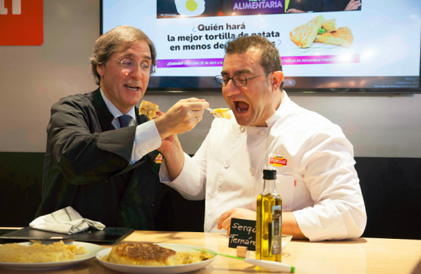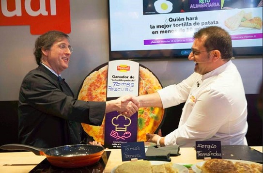 En el marco de la Feria Alimentaria y la final de Cocinero del Año, el conocido chef Sergio Fernández y el presidente de Calidad Pascual, Tomás Pascual, se han puesto la ‘chaquetilla’ de cocinero en el stand de la compañía para presentar de forma original y divertida el nuevo Preparado para Tortilla de Patata Pascual para hostelería.