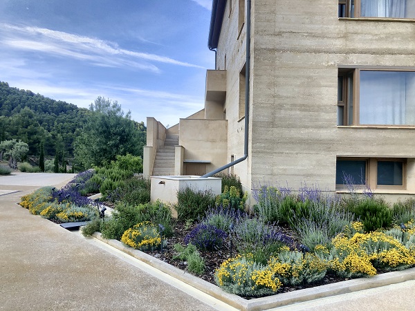 Para la rehabilitación de la masía que hoy da cobijo al hotel Torre del Marqués se utilizaron materiales naturales de proximidad para reducir al máximo la huella de CO2 del edificio. Se emplearon elementos de construcción tradicionales utilizando modernas técnicas de edificación; como los muros de Tapial creados a partir de argamasa de tierra y paja de la propia finca, los suelos de yeso pulido de Albarracín, las paredes de arcilla y piedra arenisca de los Puertos de Beceite, los alicatados de mármol de Macael Almeriense o las estructuras de pino de bosques ibéricos. Todo elaborado por artesanos y constructores locales, convirtiéndose en un sobresaliente ejemplo de economía circular.