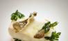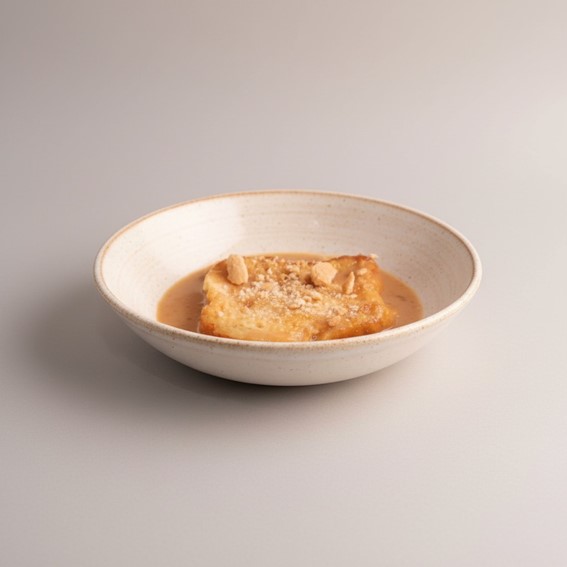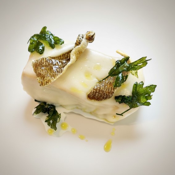 Tras escurrir el pan, el líquido se reduce y se transforma en una velouté de bacalao que potencia el sabor del conjunto. La torrija se sirve napada con esta salsa y se termina con crujientes elaborados con la piel del pescado, un toque de aceite de oliva virgen y hojas de perejil tostadas, aportando textura y matices al plato.