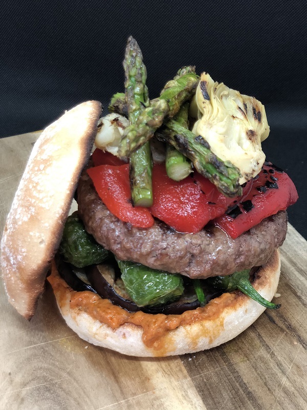 Hamburguesa de la Huerta. La última opción para celebrar el comienzo de esta soleada época es la hamburguesa de la huerta. Comenzaremos con una carne de vacuno retinto de los pastos del sur de España a la que añadiremos hortalizas de la tierra cocinadas a la plancha: berenjena, pimiento rojo, alcachofa confitada y espárragos verdes, intensa salsa romescu, y el toque crujiente tanto para tu paladar, como para tus oídos, pimientos del padrón y un crujiente pan de cristal.