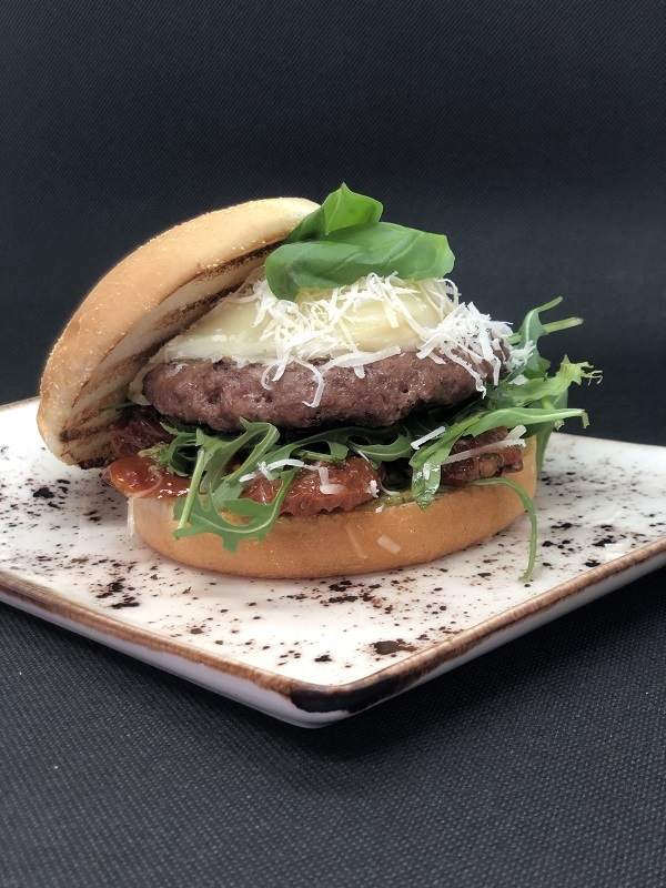 Hamburguesa de la Felicidad. Para hacer honor a este Día D, el chef nos da una idea muy sencilla con la que disfrutar al máximo. Propone una carne mixta tradicional con queso scarmoza derretido en un toque de horno, que será una maravilla para tu olfato. Después, le añadimos los ingredientes fríos; pesto, tomate semiseco y rúcula, un poco de parmesano recién rallado lleno de sabor y unas hojas de albahaca, todo ello envuelto en un ligero pan de semolina. El complemento perfecto para disfrutar en un agradable día soleado.