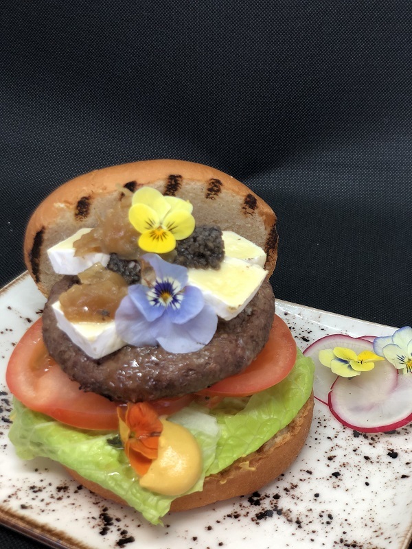 Hamburguesa Primavera. Esta hamburguesa es una explosión para los sentidos. En primer lugar, seleccionamos una carne del Pirineo de Huesca llena de sabor, incorporamos el clásico cheddar para que se derrita con la carne y los ingredientes fríos, mostaza dijon, lechuga de bativia y tomate rosa. A esta combinación llena de color, le incorporamos cebolla caramelizada, trufa y acabamos con pensamientos comestibles para terminar con este toque tan primaveral. Todo ello coronado con un tierno pan brioche, será todo un lujo para la vista.