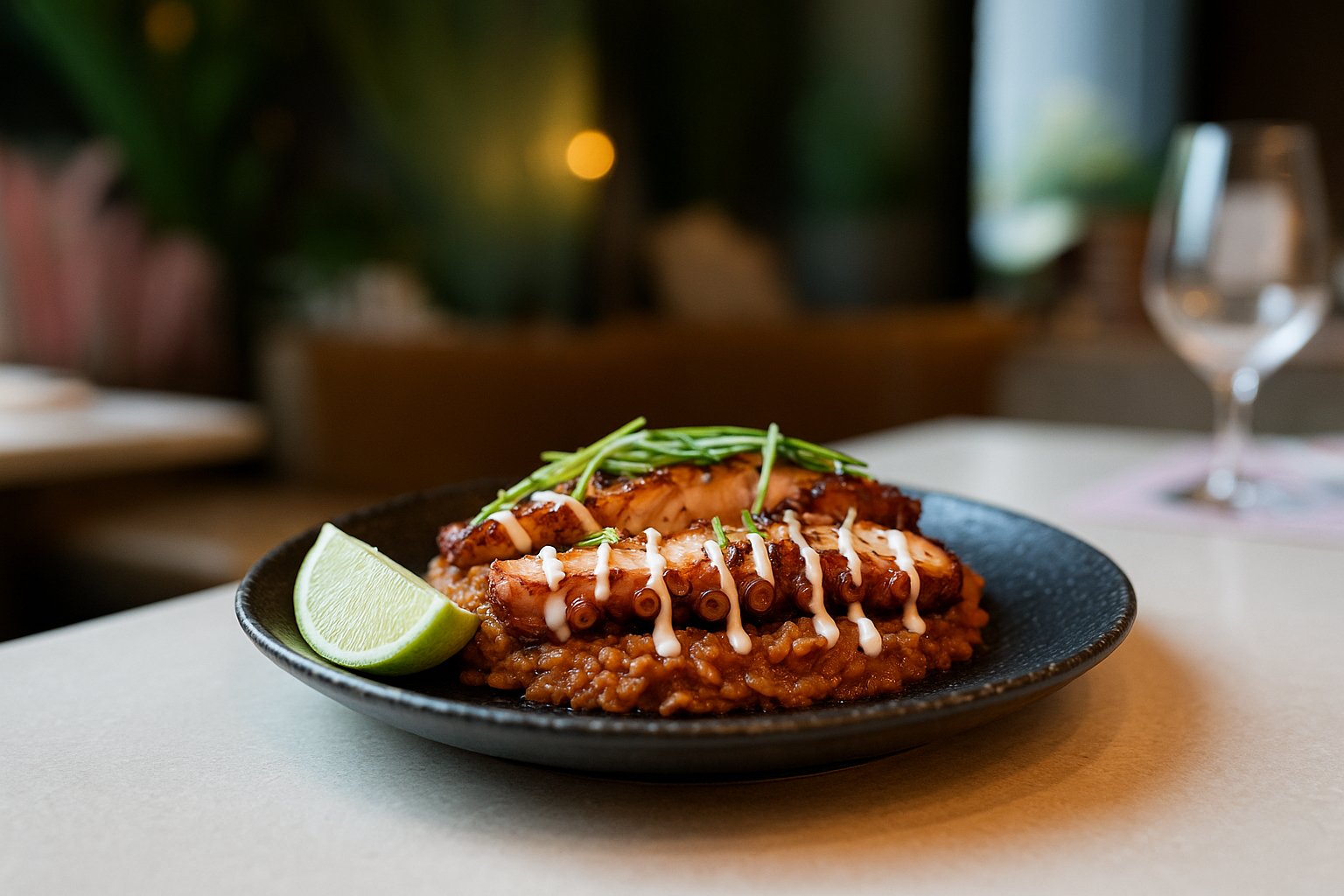 Una receta de arroz meloso cocinado con leche de coco y especias, enriquecida con pulpo en una fusión que conecta el sabor del Caribe con el Mediterráneo.