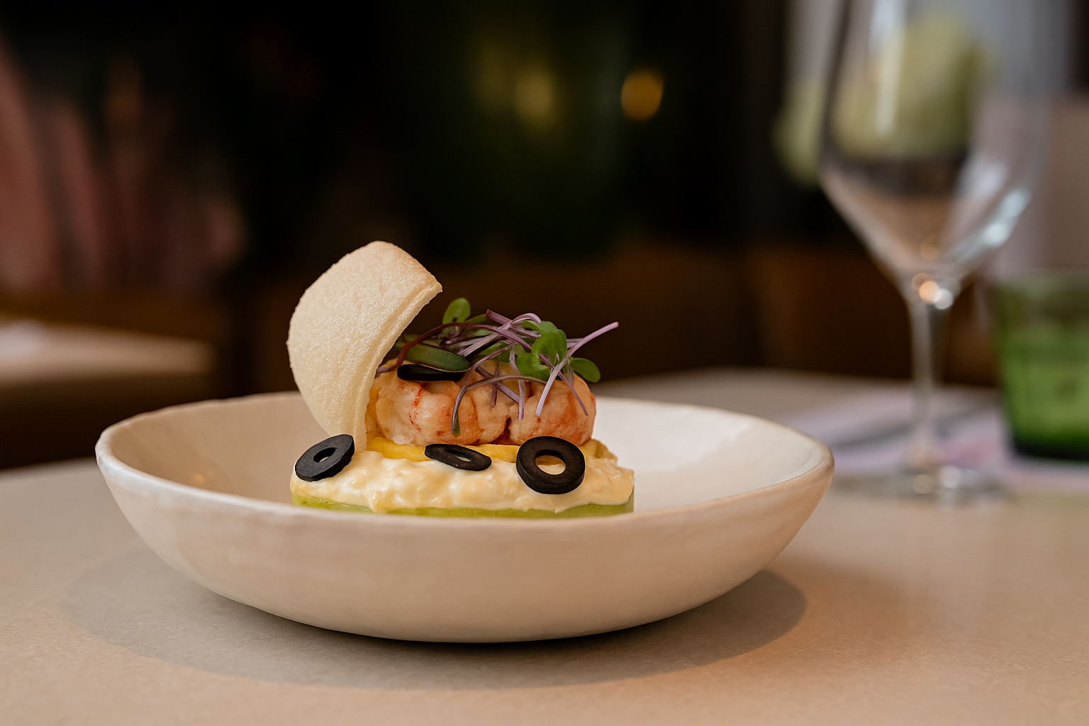 Una versión de este plato tradicional peruano elaborada con papa amarilla aliñada, ají amarillo y lima, servida con gambones como contrapunto fresco y elegante.