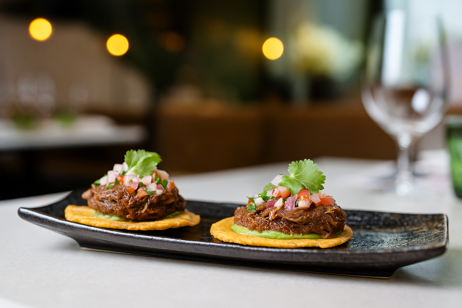Un clásico popular que combina la textura crujiente del plátano macho frito con carne de res cocinada a fuego lento y una guasacaca fresca y especiada.