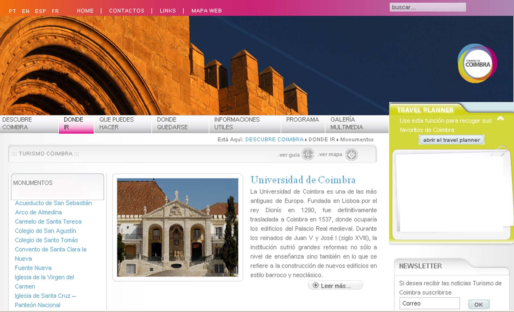 Coincidiendo con el inicio de la campaña de promoción de este destino portugués en España, y dado el incremento del acceso de españoles al portal, Turismo de Coimbra ha decidido introducir nuevas funcionalidades que permitan al viajero documentarse y planificar su estancia en la ciudad de forma ágil y sencilla.