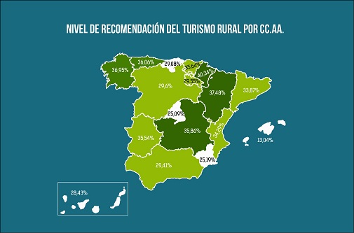 Según los datos del último informe del Observatorio del Turismo Rural, el sector obtiene un nivel de recomendación del 33,10%, lo que indica un alto nivel de satisfacción por parte de los viajeros. Por autonomías, Navarra (40,34%), Aragón (37,48%) y Galicia (36,95%) son las comunidades con los índices más altos.