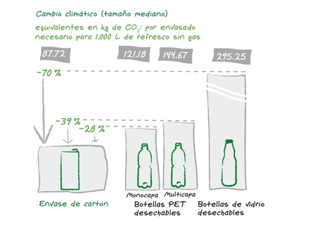 Un análisis del ciclo de vida realizado a escala europea sobre botellas PET desechables, botellas de vidrio desechables y envases de cartón para refrescos sin gas confirma que en todos los tamaños disponibles, y en comparación con las alternativas de envasado comercialmente existentes, los envases de cartón presentan el perfil medioambiental que ofrece ventajas más significativas en lo que respecta, en particular, a la emisión de CO2, al uso de recursos fósiles y al consumo de energía primaria. En el formato de un litro, el tamaño de envase de mayor relevancia en el mercado, los envases de cartón generan un 28 por ciento menos de CO2, utilizan un 51 por ciento menos de recursos fósiles y consumen un 24 por ciento menos de energía primaria en comparación con las botellas PET monocapa. El reciente estudio, realizado por el Institute for Energy and Environmental Research (IFEU) y sometido a verificación independiente, atribuye el positivo perfil medioambiental del envase de cartón principalmente al buen rendimiento medioambiental de su materia prima principal, incluyendo su renovabilidad y uso eficiente en términos de recursos de materiales. Ya hoy en día, los envases de cartón se componen de hasta un 75 por ciento de fibra de madera – un recurso natural, completamente renovable y de carácter biológico.