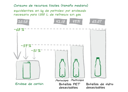 El uso eficiente en términos de recursos de una materia prima renovable – que se fabrica utilizando principalmente una elevada fracción de energía renovable – y su bajo peso contribuyen enormemente al positivo rendimiento medioambiental del envase de cartón. Los envases de cartón utilizan muchos menos recursos fósiles que las botellas de PET y vidrio, ya que se componen de hasta un 75 por ciento de fibra de pulpa obtenida de la madera, es decir, de una fuente renovable. En consecuencia, en la categoría de impacto, “Uso de la naturaleza” el envase de cartón queda por detrás de los formatos de envase fabricados a partir de materias primas basadas en recursos fósiles; sin embargo, en contraste con los recursos finitos, con una gestión responsable de los bosques se puede establecer un suministro constante de esta materia prima renovable. A esto se le añade el hecho de que la madera es carbono neutral y por consiguiente no altera el equilibrio de CO2 de la atmósfera. La razón de esta neutralidad de CO2 es que mientras crecen, los árboles extraen dióxido de carbono de la atmósfera y lo almacenan. Cuando posteriormente, se queman o se descomponen, liberan la misma cantidad de CO2 que absorbieron durante su vida.