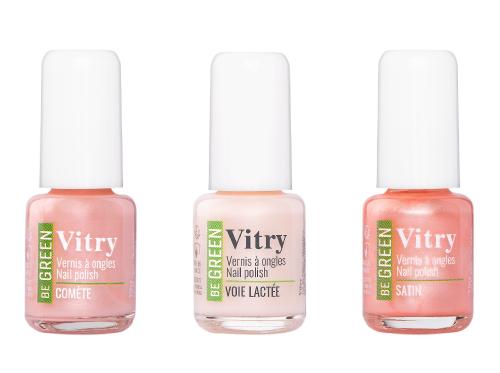 La marca francesa Vitry, la firma nº1 de lacas de uñas en Francia en farmacia y parafarmacia (según IMS Pharmatrend IQVIA), y experta en manicura y pedicura desde 1795, propone esta tendencia en tus uñas con tres tonos indispensables: Comète, Voie Lactée y Satin, pertenecientes a su gama BE GREEN, compuestas por hasta un 84% de ingredientes BIO y hasta un 74% de origen natural (ISO 16128), y fabricadas en Francia.