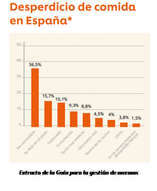 Desde la compra: donde se debe tener un control a tiempo real de las existencias y productos vendidos; el almacenaje: que debe tener una visión general de las existencias utilizando un mejor sistema de etiquetado de fechas; la preparación: es recomendable preparar la comida sólo cuando existe la seguridad de que se va a consumir; las raciones y el desperdicio en el plato: se debe prestar especial atención a las raciones, si éstas son correctas, se evitará que sobre demasiada comida en el plato y se producirá menos desperdicio en cocina y por último, en el apartado eliminación, se sugiere que se pueden eliminar residuos orgánicos de manera sostenible.