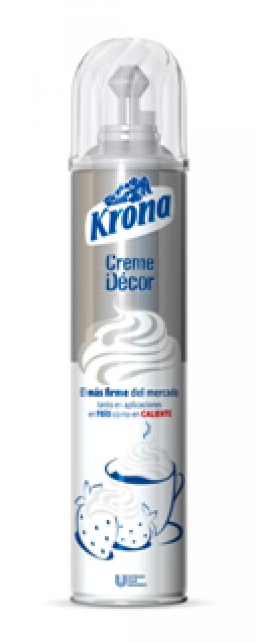 La nueva Krona Créme Decor se caracteriza por ser el spray más firme del mercado gracias a su receta y a la boquilla profesional que forma el envase. Cuando se utiliza para elaborar o decorar un plato, aguanta en perfecto estado hasta 15 minutos en temperatura ambiente y unos 9 sobre superficies calientes.
