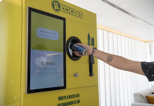 En el caso de las máquinas, los usuarios solo deben depositar todas sus latas y botellas de plástico de bebidas en una máquina de RECICLOS y escanear el QR que mostrará la máquina.