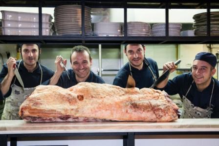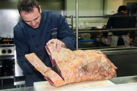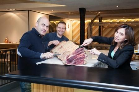 Rooster (Juan Bravo, 25. Madrid. www.rooster-restaurante.com) sigue apostando por el producto, por la trazabilidad del mismo, y por traer la mejor calidad de pequeños productores. Su chef, Alfonso Castellano, viajó hace unas semanas a Silleda, un pueblecito de Pontevedra, para conocer a la vaca de la que adquiriría el lomo completo. De raza rubia gallega, criada con mucho mimo por José Manuel, fue cepillada diariamente (lo que hace que la grasa se infiltre y se distribuya por todo el cuerpo) y alimentada a base de maíz, cereales y salvado de trigo del molino de la aldea contigua. Fue sacrificada el pasado 10 de noviembre en el matadero de Bandeira, y llevada a la Carnicería Cuiña, donde Miguel la troceó y la ha mantenido en su cámara, exenta de humedad, para su correcta maduración.