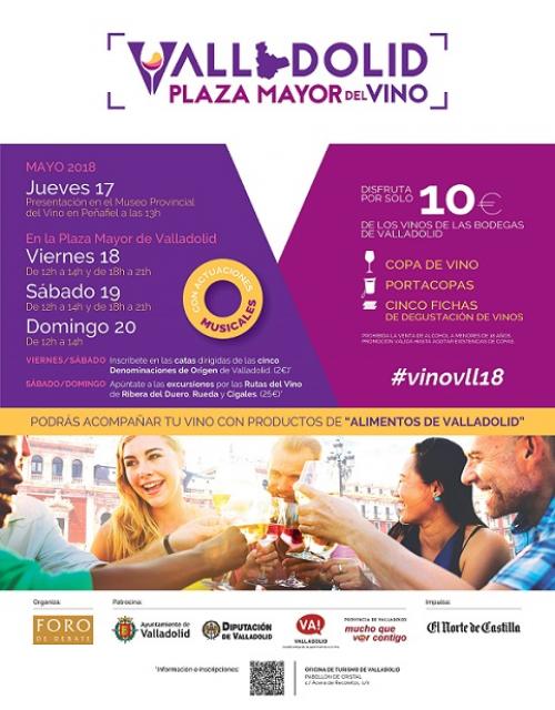 “Valladolid, Plaza Mayor del Vino congregará este fin de semana (18-20 de mayo) en la Plaza Mayor de Valladolid a cuarenta bodegas de las cinco denominaciones de origen de la provincia -Ribera del Duero, Rueda, Cigales, Toro y Tierra de León- y a diez estands con productos “Alimentos de Valladolid”.