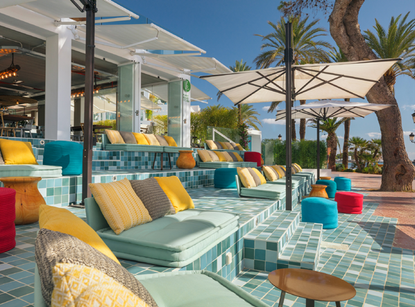 para darse un respiro del cálido sol ibicenco. Su estiloso interior, con cocina a la vista y exposición de producto fresco, está inundado de luz natural.
